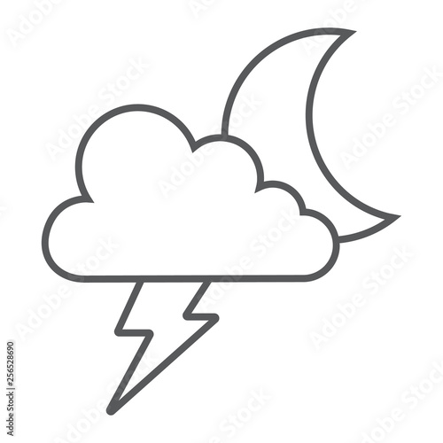 Cloud and lightning thin line icon, forecast and climate, thunder sign, vector graphics, a linear pattern on a white background.