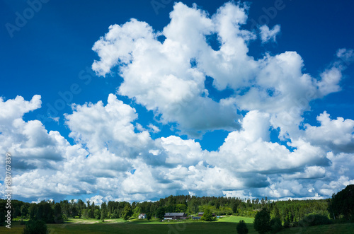 Cloudscape with white fluffy clouds on blue sky over Scandinavian rural landscape, Nature of Sweden in summer, Farmhouses by forest and green fields