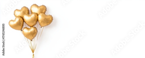 cluster of shiny gold heart-shaped balloons floating against a plain white background, symbolizing love and celebration.