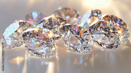 Cluster of sparkling cut diamonds reflecting light on a smooth surface, showcasing brilliance and clarity in a stunning display