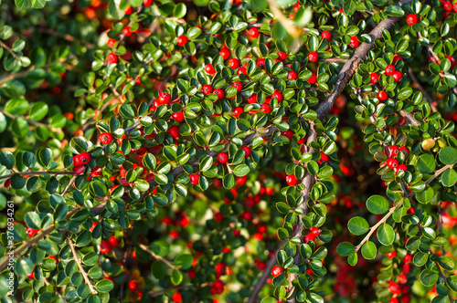 Clusters of red berries of a Cotoneaster horizontalis Decne. illuminated by soft evening sunlight, autumn background