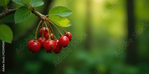Clusters of small red rowan berries hanging from branch tips, organic, forest floor, nature