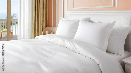 Coastal bedroom view; white bedding; calm ocean; luxury hotel room; interior design inspiration.