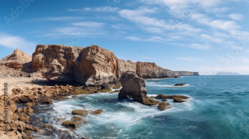 Coastal Landscape Featuring Majestic Rocky Cliffs and Vibrant Blue Waters Under a Clear Sky in a Beautiful Natural Setting