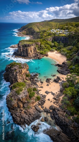 Coastal paradise showcases a secluded beach nestled between rocky headlands, azure waters, and lush green vegetation under a bright, cloudy sky