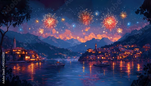 Coastal town celebrates with fireworks display over water during festive holiday night