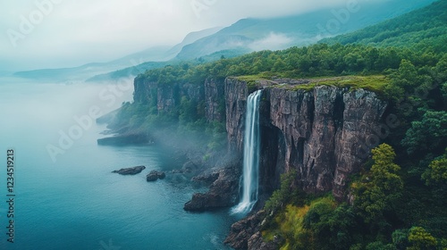 Coastal waterfall cliff, misty fjord, aerial view, nature