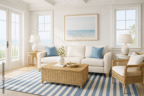 Coastal-inspired living room with white sofa, wicker furniture, and ocean view through bright windows in serene beach house interior design style. Ai generative