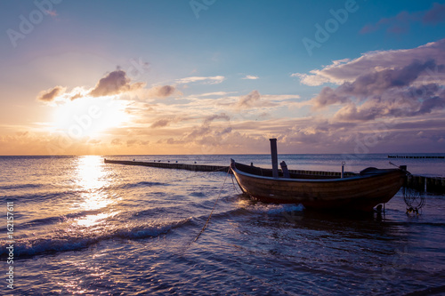 Coastline with a special dreamy mood on the beach with a wooden boat