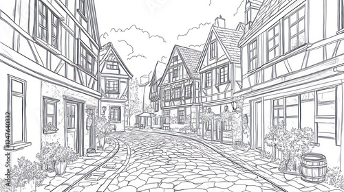 Cobblestone street, medieval houses, idyllic town, sunny day, coloring book