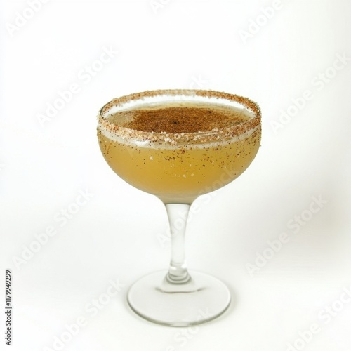 Cocktail in a glass with a rim of spices, showcasing a light amber drink, suggesting a refreshing beverage option.