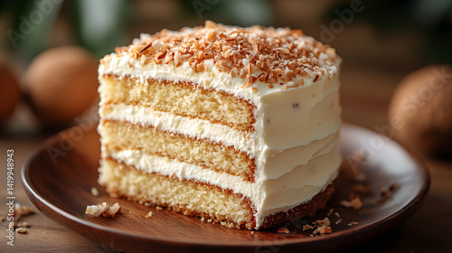 Coconut layer cake with creamy coconut filling and rich frosting on rustic dish