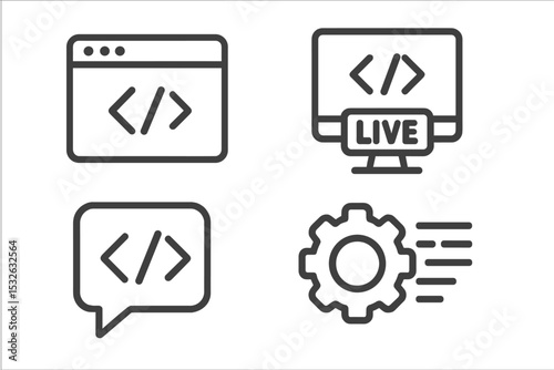 Coding icons with code window, live monitor, chat bubble, and gear vector icon illustration
