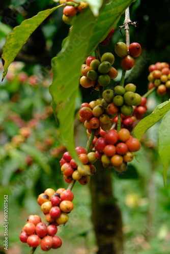 Coffea canephora is a species of coffee plant originating from central and western sub-Saharan Africa. It is a species of flowering plant in the Rubiaceae family. Ripe coffee beans in tree branch.