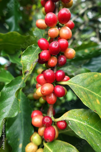 Coffee beans ripening on a tree.