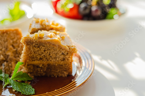 Coffee cake layered with coffee buttercream and walnuts, Colombian coffee and walnut cake