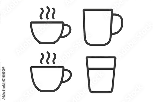 Coffee cup and tea mug line icon set. Hot drink and beverage outline symbols. Vector collection of simple glass and cup pictograms for cafe menu, web, or mobile app design.
