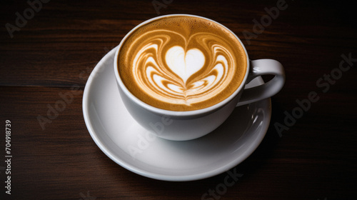 Coffee cup with heart shape latte art on wooden table.