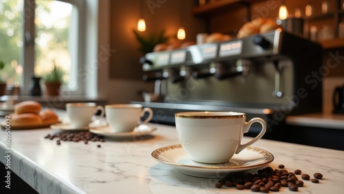 Coffee cups and coffee beans on a marble countertop in a cafe.