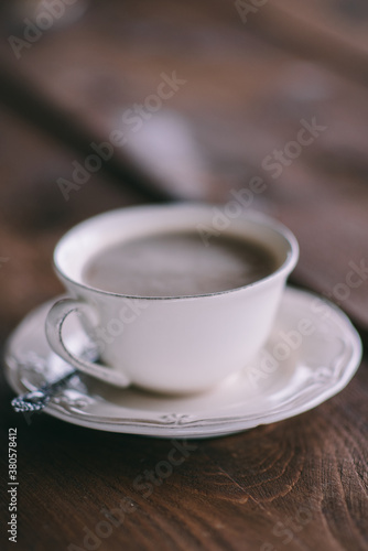 Coffee in a vintage cup on a wooden table