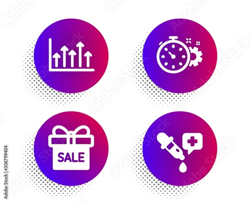 Cogwheel timer, Sale offer and Growth chart icons simple set. Halftone dots button. Chemistry pipette sign. Engineering tool, Gift box, Upper arrows. Laboratory. Business set. Vector