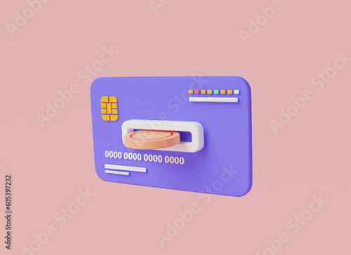 Coin coming out credit or debit card on pink background. refund money, online payment, banking, money-saving, Financial transaction, cashback, money transfer. 3d render illustration. cartoon minimal