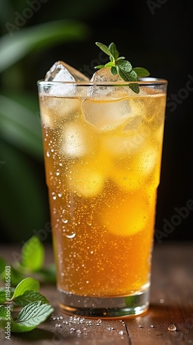 Cold drink golden liquid ice cubes fizzy beverage