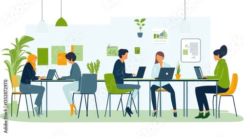 Collaborative Workspace with Diverse Team Members Using Laptops in a Modern Office Setting