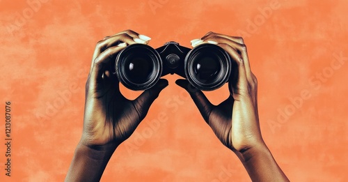Collage minimaliste de deux mains tenant des jumelles sur un fond orange symbolisant la vision ou l'avenir.