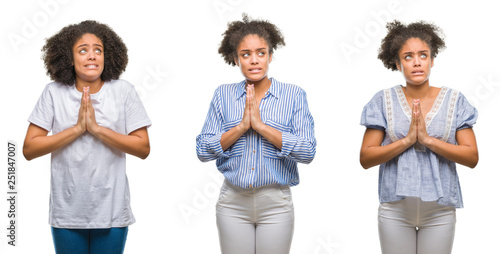 Collage of african american woman over isolated background begging and praying with hands together with hope expression on face very emotional and worried. Asking for forgiveness. Religion concept.