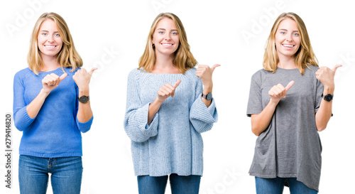 Collage of beautiful blonde woman over white isolated background Pointing to the back behind with hand and thumbs up, smiling confident