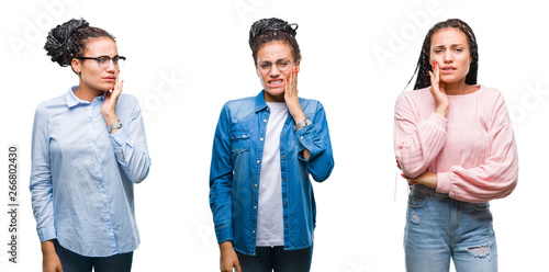 Collage of beautiful braided hair african american woman over isolated background touching mouth with hand with painful expression because of toothache or dental illness on teeth. Dentist concept.