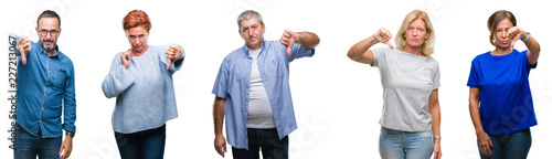 Collage of group of middle age and senior people over isolated background looking unhappy and angry showing rejection and negative with thumbs down gesture. Bad expression.