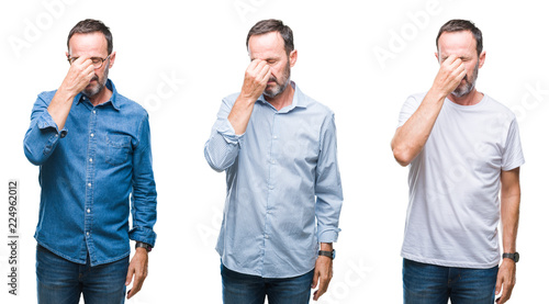 Collage of handsome senior hoary man standing over isolated background tired rubbing nose and eyes feeling fatigue and headache. Stress and frustration concept.