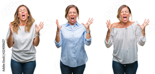 Collage of middle age hispanic woman over isolated background crazy and mad shouting and yelling with aggressive expression and arms raised. Frustration concept.