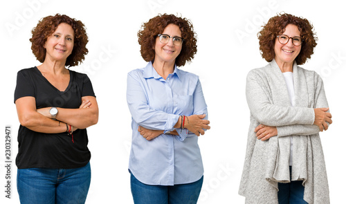 Collage of middle age senior woman over white isolated background happy face smiling with crossed arms looking at the camera. Positive person.