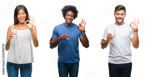 Collage of people drinking glass of water over isolated background doing ok sign with fingers, excellent symbol