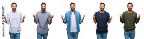 Collage of young man wearing casual look over white isolated backgroud celebrating surprised and amazed for success with arms raised and open eyes. Winner concept.
