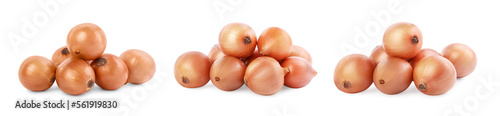 Collage with fresh ripe onions on white background