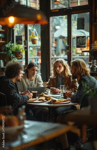 Colleagues gather in cozy kitchenette, chatting over coffee and sandwiches
