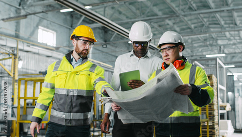 Colleagues having discussion talk conversation chat cooperation on industrial manufacturing workplace during working process. Middle-aged men walking communicating.