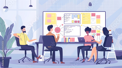 Colleagues helping each other, working on project together. Brainstorming in modern office space. Teamwork.