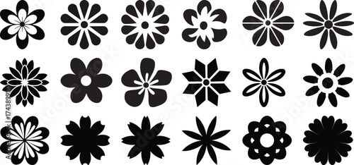 Collection of 18 Black and White Stylized Flower Icons and Silhouettes