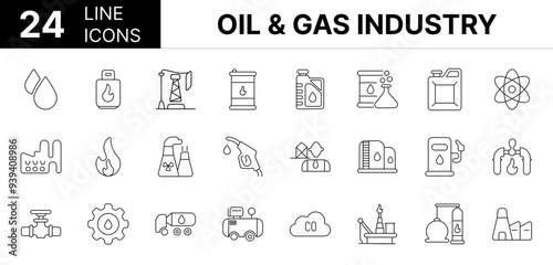 Collection of 24 oil & gas industry line icons featuring editable strokes. These outline icons depict various modes of oil & gas industry, gas refinery, crude oil, lubricant, gas pump, fossil
