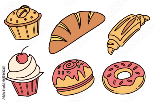 Collection of assorted bakery items including bread, croissant, cupcake, and donut