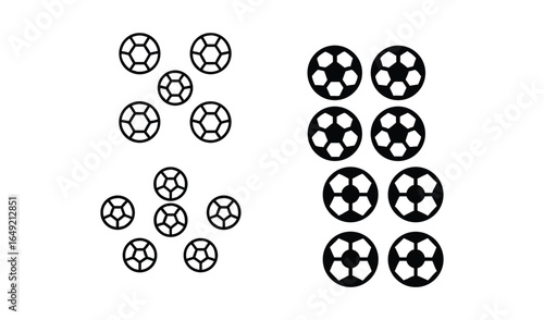 Collection of black and white soccer balls arranged in patterns