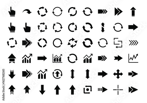 Collection of black arrow and graph icons on white background