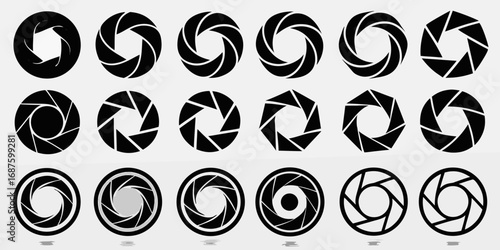 Collection of black camera aperture icons and symbols on a white background