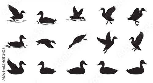 Collection of black duck silhouettes in various icon styles on a single sheet.