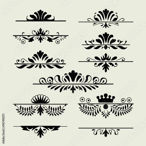 Collection of Black Minimal Ornate Design Elements with Crown Accents..